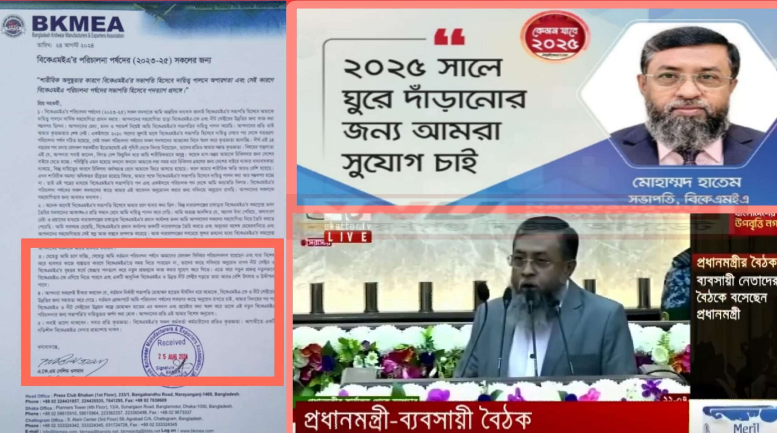 শেখ হাসিনা ৫ আগষ্টে দেশ ছেড়ে ভারতে আশ্রয়ের পর গাঢাকা দেয় ফ্যাসিস্ট সরকারের সকলে। আর ভোল পাল্টায় সেই ফ্যাসিস্ট সরকারের অনেকেই । তাদের মধ্যে অন্যতম এই হাতেম । এরপর ২৫ আগষ্ট নাারয়ণগঞ্জের সেই কুখ্যাত ওসমান পরিবারের অন্যতম হোতা বিকেএমইএ এর  ১৪ বছরের দখলকারী সভাপতি সেলিম ওসমান তার পদত্যাগ পত্র অজ্ঞাত স্থান থেকে পাঠিয়ে তাতে উল্লেখ করেন  “আপনারা সবাই স্বীকার করবেন যে, বর্তমান নির্বাহী সভাপতি মোহাম্মদ হাতেম দীর্ঘদিন ধরে আমাকে, বিকেএমইএ- তে ও নীট সেক্টরের উন্নতির জন্য সহায়তা করে গেছে । বর্তমান প্রেক্ষাপটে আমি পরিচলনা পর্ষদের সকলের কাছে অনুরোধ রাখতে চাই, আমার বিদায়ের পর পর বিকেএমইএ ও নীট সেক্টরের উন্নয়ন কল্পে মোহাম্মদ হাতেম এর অবদান এবং প্রচেষ্টায় কথা স্বরণ করে তাকে এই নতুন বিকেএমইএ পরিচালনার জন্য সভাপতির দায়িত্বভার অর্পন কার হোক। আপনাদের প্রতি এই আমার বিশেষ অনুরোধ।”