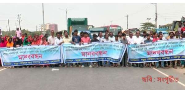 আজ রোববার (২০ এপ্রিল) দুপুরে ফতুল্লার লামাপাড়া এলাকায় ঢাকা-নারায়ণগঞ্জ লিংক রোড অবরোধ করে এই মানববন্ধন কর্মসূচি পালন করেন তাঁরা। এমন মানববন্ধনের কারণে  দীর্ঘ যানজট সৃষ্টি হয়।