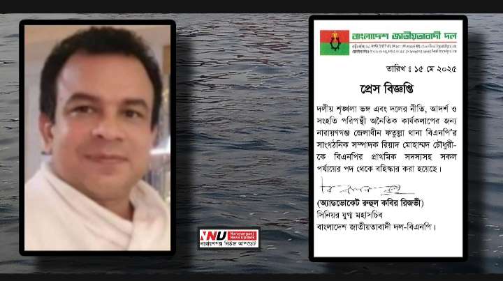 দলীয় শৃঙ্খ লা ভঙ্গ এবং দলের নীতি, আদর্শ ও সংহতি পরিপন্থী অনৈতিক কার্যকলাপের জন্য নারায়ণগঞ্জ জেলাধীন ফতুল্লা থানা বিএনপির সাংগঠনিক সম্পাদক রিয়াদ মোহাম্মদ চৌধুরীকে বিএনপির প্রাথমিক সদস্যসহ সকল পর্যায়ের পদ থেকে বহিস্কার করা হয়েছে।