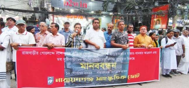 নারায়ণগঞ্জ ‘সাংস্কৃতিক জোটের আয়োজনে এমন মন্তব্য করেছেন বক্তারা। বুধবার ১১ সেপ্টেম্বর বিকেলে নারায়ণগঞ্জ প্রেসক্লাবের সামনে মানববন্ধন ও প্রতিবাদ সমাবেশ অনুষ্ঠিত হয়েছে।