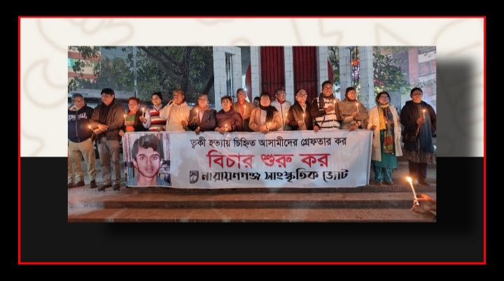 নারায়ণগঞ্জ সাংস্কৃতিক জোটের সভাপতি মনি সুপান্থের সভাপতিত্বে এবং সাধারণ সম্পাদক দিনা তাজরিনের সঞ্চালনায় অনুষ্ঠিত কর্মসূচিতে আরও বক্তব্য রাখেন সন্ত্রাস নির্মূল ত্বকী মঞ্চের সদস্য সচিব হালিম আজাদ, সিপিবির জেলা সভাপতি শিবনাথ চক্রবর্তী, নারায়ণগঞ্জ নাগরিক কমিটির সাধারণ সম্পাদক জাহিদুল হক দিপু, সুজনের জেলা আহ্বায়ক ধীমান সাহা জুয়েলসহ বিভিন্ন রাজনৈতিক, সামাজিক ও সাংস্কৃতিক সংগঠনের নেতৃবৃন্দ।